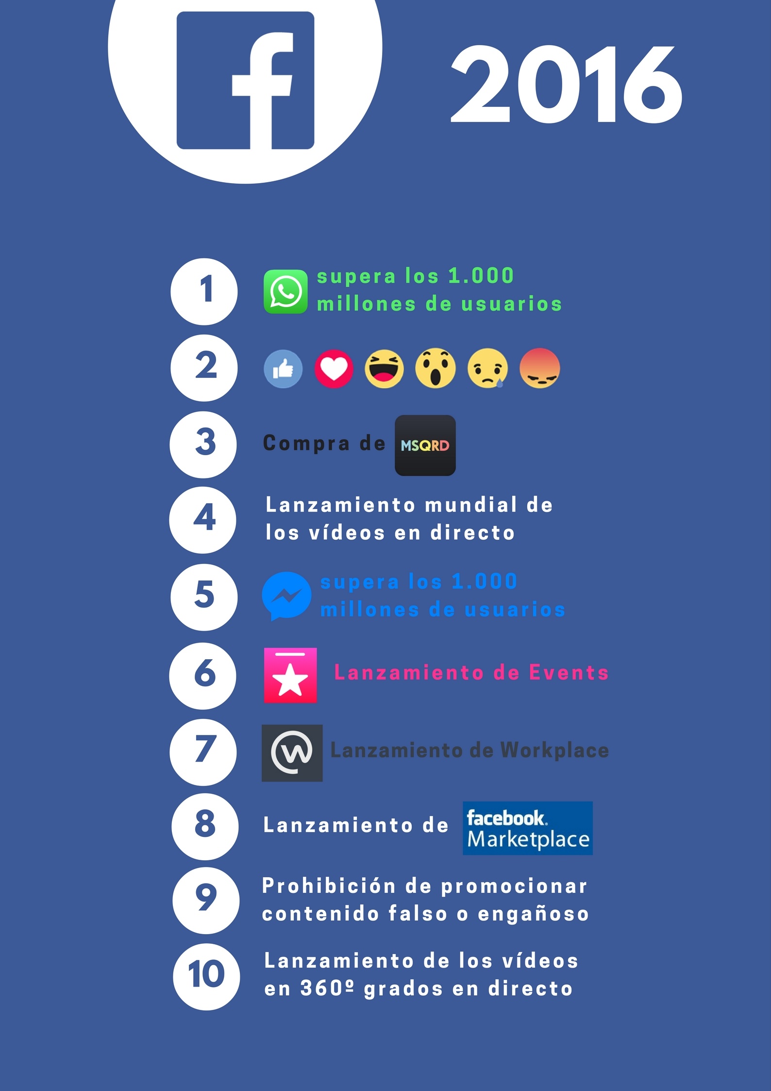 En julio, Facebook alcanza los 1,490 millones de usuarios activos mensuales, consolidándose como la red social más dominante del mundo, con un crecimiento notable, especialmente en mercados internacionales. En septiembre, introduce "Facebook Live", permitiendo a los usuarios transmitir videos en vivo a sus amigos, una función que se convierte en un pilar fundamental de la interacción social en la plataforma.